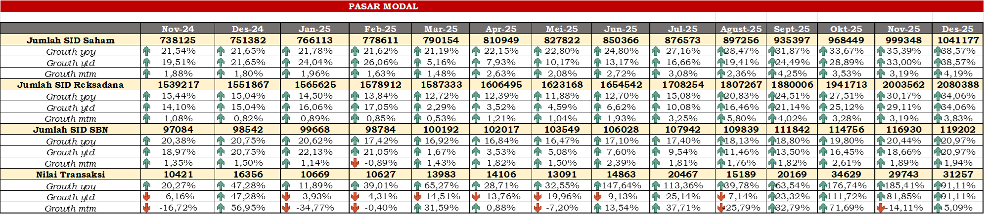 Transaksi Pasar Modal di Jawa Tengah didominasi oleh investor individu dengan jumlah SID Reksadana mencapai 2.003.562 investor pada November 2025 meningkat 30,17 persen (yoy) dengan total nilai transaksi Rp29,74 triliun. Sementara itu jumlah SID saham sebesar 999.348 investor yang meningkat sebesar 35,39 persen (yoy) dan SID SBN sebesar 116.930 investor dan meningkat sebesar 20,44 persen (yoy).