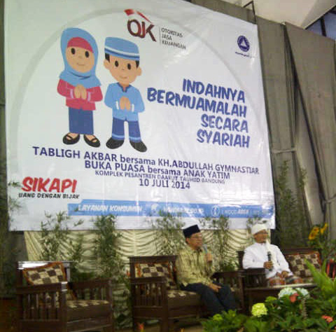 Anggota Dewan Komisioner OJK Firdaus Djaelani bersama pemimpin pondok pesantren Daarut Tauhid Bandung K.H. Abdullah Gymnastiar dalam acara Tabligh Akbar yang diadakan di Komplek Pesantren Daarut Tauhid, Bandung (10/7). Acara bertajuk Indahnya Bermuamalah Secara Syariah ini merupakan salah satu bagian dari rangkaian acara OJK Goes to Pesantren untuk sosialisasi peran OJK dan program literasi keuangan. Acara ini juga dihadiri pimpinan bank syariah se-Jawa Barat.