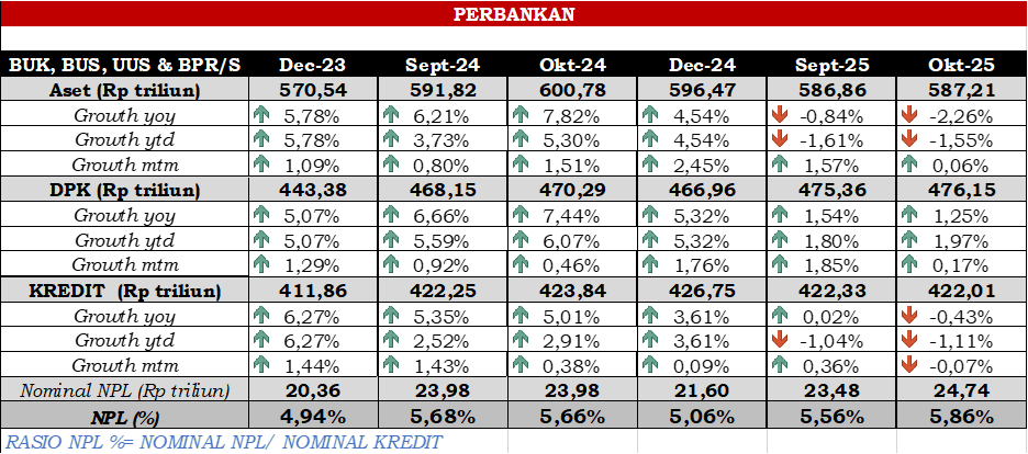 Dana Pihak Ketiga (DPK) mengalami kenaikan 1,25 persen (yoy) menjadi sebesar Rp476,15 triliun dan kredit yang disalurkan terkontraksi sebesar -0,43 persen (yoy) menjadi sebesar Rp422,01 triliun, Aset perbankan di Jawa Tengah terkontraksi sebesar -2,26 persen (yoy) atau menjadi sebesar Rp587,21 triliun.