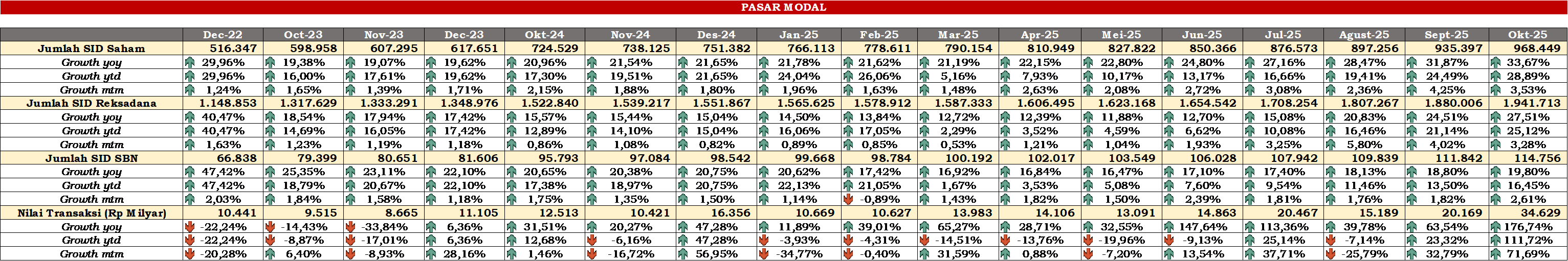Transaksi Pasar Modal di Jawa Tengah didominasi oleh investor individu dengan jumlah SID Reksadana mencapai 1.941.713 investor pada Oktober 2025 meningkat 27,51 persen (yoy) dengan total nilai transaksi Rp34,63 triliun. Sementara itu jumlah SID saham sebesar 968.449 investor yang meningkat sebesar 33,67 persen (yoy) dan SID SBN sebesar 114.756 investor dan meningkat sebesar 19,80 persen (yoy).