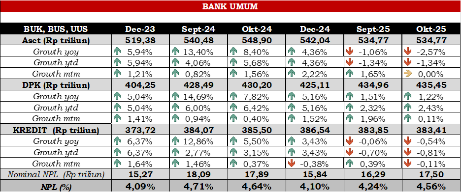 Selanjutnya, untuk Aset Bank Umum di Jawa Tengah terkontraksi sebesar -2,57 persen (yoy) atau menjadi sebesar Rp534,77 triliun, hal ini diikuti dengan Kredit Bank Umum di Jawa Tengah yang terkontraksi sebesar -0,54 persen (yoy) menjadi Rp383,41 triliun turun. Sementara Dana Pihak Ketiga (DPK) Bank Umum di Jawa Tengah tercatat tumbuh sebesar 1,22 persen (yoy) menjadi Rp435,45 triliun.