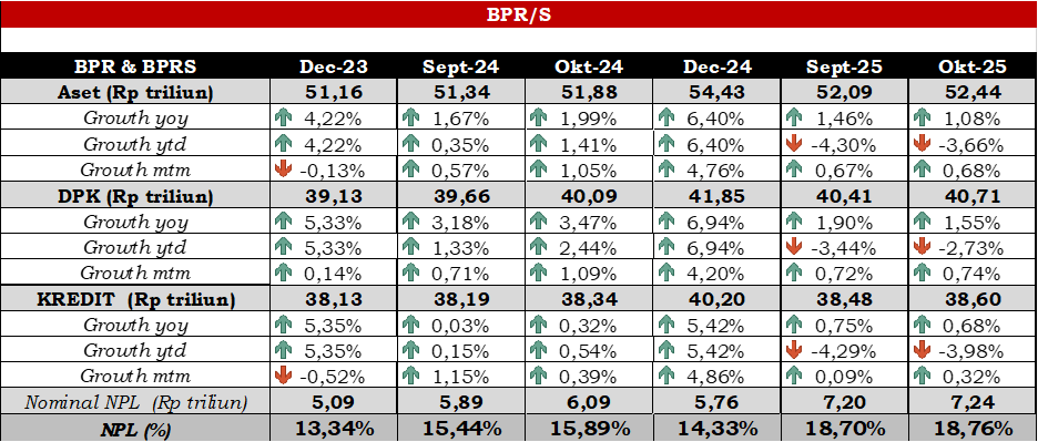 Perkembangan BPR/S di Jawa Tengah juga mencatatkan kinerja yang positif dengan pertumbuhan aset sebesar 1,08 persen (yoy) yang diikuti dengan Dana Pihak Ketiga (DPK) BPR/S di Jawa Tengah yang tercatat tumbuh sebesar 1,55 persen (yoy) sebesar Rp40,71 triliun meskipun Kredit BPR/S di Jawa Tengah terkontraksi sebesar 0,68 persen (yoy) menjadi Rp38,60 triliun.