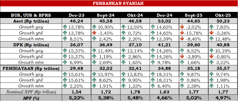 Kinerja Perbankan Syariah di Jawa Tengah per Oktober 2025 juga mencatatkan kenaikan dilihat dari pertumbuhan aset sebesar 7,83 persen (yoy) yang diikuti dengan pertumbuhan Dana Pihak Ketiga (DPK) yang tumbuh sebesar 10,19 persen (yoy) dengan nominal mencapai Rp40,88 triliun. Adapun pembiayaan yang disalurkan tumbuh sebesar 9,74 persen (yoy) dengan nominal mencapai Rp35,57 triliun.
